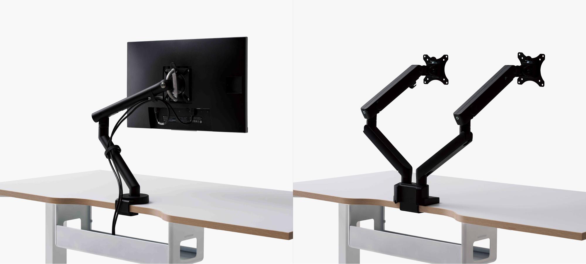 Thiết kế thông minh cho phép lắp đặt tay nâng màn hình ở trung tâm bàn mà không ảnh hưởng đến khay đi dây phía sau.