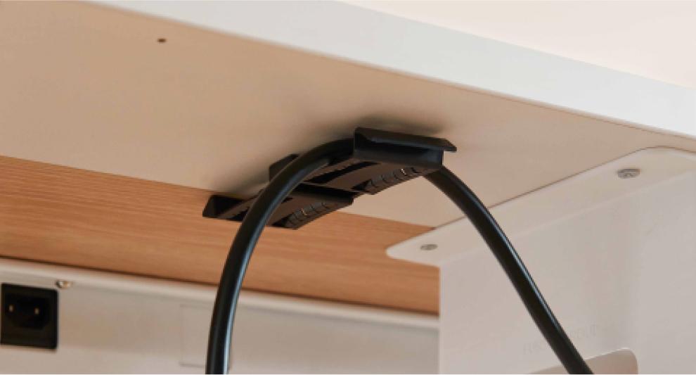 Bàn đi kèm hệ thống kẹp dây thông minh, hỗ trợ cố định và quản lý dây cáp hiệu quả. Nhờ đó, khu vực làm việc luôn ngăn nắp và đảm bảo an toàn điện.